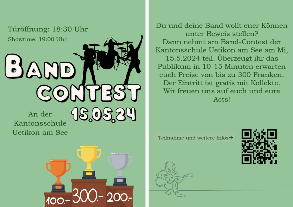 Am Mittwoch, dem 15. Mai 2024 um 19 Uhr (Türöffnung um 18:30 Uhr), findet an der Kantonsschule Uetikon am See ein Band-Contest statt. Dieser ist für die ganze Region Zürichsee und wir laden Bands ein, die uns auf der Bühne überzeugen wollen.