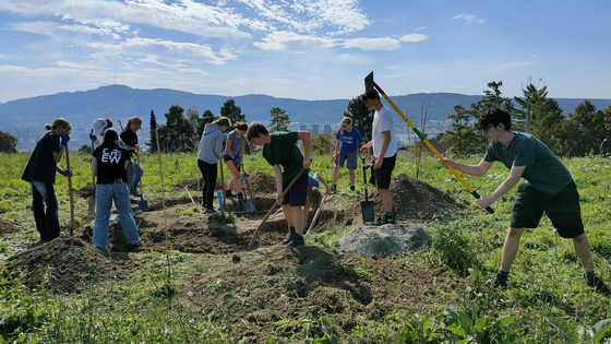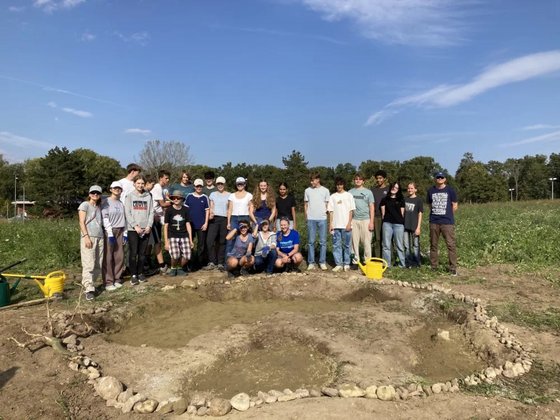 Das Nahrungsangebot für Wildbienen auf dem blühenden und artenreichen Vuebelle ist sehr reichhaltig. Mit zwei Sandinseln haben die fleissigen Insekten nun auch noch ausreichend Nistmöglichkeiten erhalten. Die Sandinseln symbolisieren auf dem Vuebelle die beiden Brunnen vom Bellevue. Da der grosse Brunnen einen Durchmesser von 4 Meter hat, gab es für die Schüler:innen ordentlich zu graben und Sand zu schleppen.