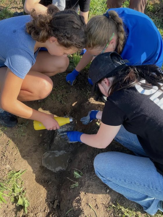 Die Schüler:innen staunten nicht schlecht, als beim Ausheben des Loches für die Sandinsel dann ein spezieller Stein zum Vorschein kam. Das Ausgrabungs-Fieber wurde geweckt und der Fund wurde säuberlich inspiziert. Die Stadtarchäologie von Zürich gab Entwarnung: Es handelt sich um einen Mark-/Grenzstein, ein neuzeitliches Exemplar, wohl aus dem 19. Jahrhundert aus Tessiner Granit. Der Stein durfte als Mitbewohner in der Bienen-Sandinsel bleiben.