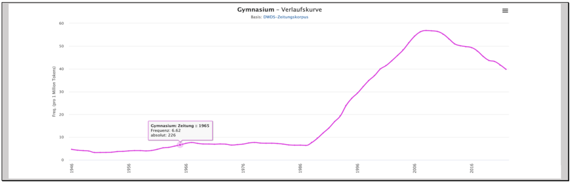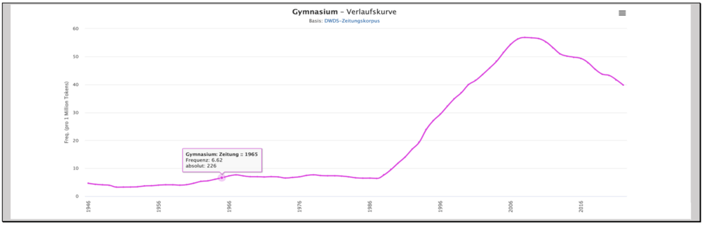 PS: Das Bild zeigt die Wortverlaufskurve für „Gymnasium“, erstellt durch das Digitale Wörterbuch der deutschen Sprache, <https://www.dwds.de/r/plot/?view=1&corpus=zeitungenxl&norm=date%2Bclass&smooth=spline&genres=0&grand=1&slice=1&prune=0&window=3&wbase=0&logavg=0&logscale=0&xrange=1946%3A2022&q1=Gymnasium>, abgerufen am 7.12.2022.