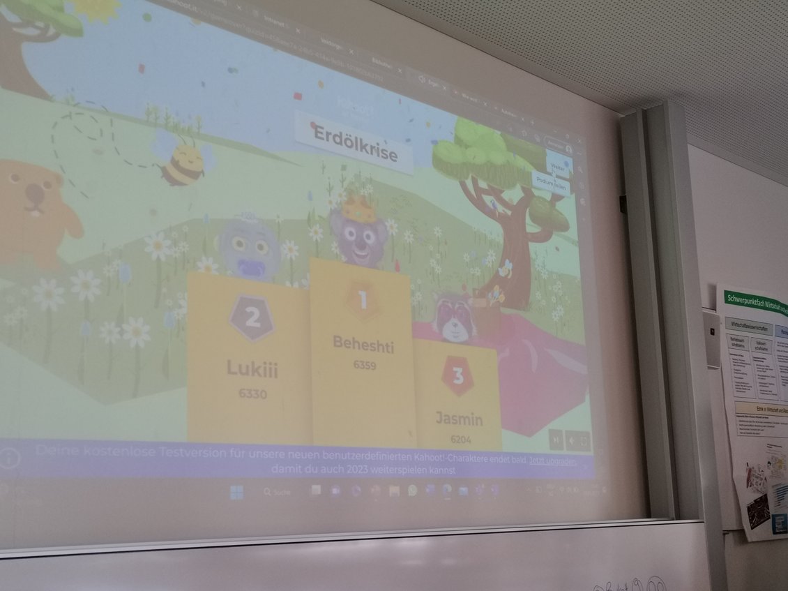 Auch wenn nicht alles perfekt war und ich ab und zu gewisse Themengebiete erläutern musste, könnte ich noch lange mit meiner Schwärmerei fortfahren. Was mich besonders überrascht hat, waren meine Erkenntnisse durch den Perspektivenwechsel und wenn sie noch so klein waren: Klar formulierte Arbeitsaufträge sind für das Erledigen von Aufträgen unerlässlich. Wenn ich während Einzelarbeitsphasen gefragt wurde, ob es meinerseits offene Fragen gibt, fühlte ich mich abgeholt. Während Gruppenarbeiten wird wirklich über die Fragen/Aufgaben geredet und das sehr vertieft. Viele weisen mehr Vorwissen auf, als ich gedacht habe. Und zu guter Letzt: Während einem Kahoot ist es nicht laut, weil alle schwatzen, sondern weil alle über die Fragen diskutieren und viele den Ehrgeiz packt – so auch mich, wie man auf dem Bild erkennen kann.