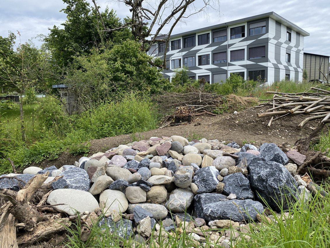 Die Entscheidung fiel auf eine Steinlinse: Steinlinsen bieten Deckung, Sonnenplätze und ein geeignetes Mikroklima für Reptilien wie Eidechsen und Blindschleichen. Steinlinsen können auch als Winterquartier dienen, wenn sie genügend tief ins Erdreich eingelassen sind.
