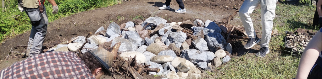 Mit viel Muskelkraft und Ausdauer gruben wir ein Loch von 80 Zentimeter Tiefe und 1 bis 3 Meter Durchmesser. Gefüllt wurde es am dritten Nachmittag mit alten Baumstrünken, Ästen und drei Kubikmeter grossen Steinen.