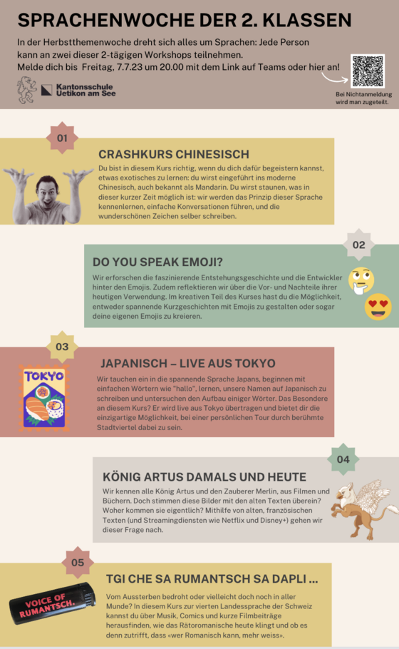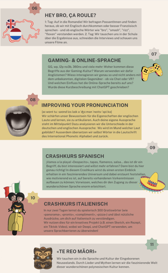 Die Sprachenwoche findet im Rahmen der Herbstthemenwoche vom 2. bis 6. Oktober 2023 statt und steht ganz im Zeichen von Linguistik oder Crashkursen. Das Besondere? Die Kurse sind jahrgangsübergreifend, damit die Schülerinnen und Schüler die Möglichkeit haben, mit neuen Kolleg:innen zusammen zu lernen. Dazu wählten sie vor den Sommerferien zwei Kurse aus dem Katalog aus (siehe die beiden ersten Bilder unten), die sie am Montag/Dienstag und Donnerstag/Freitag besuchen werden.