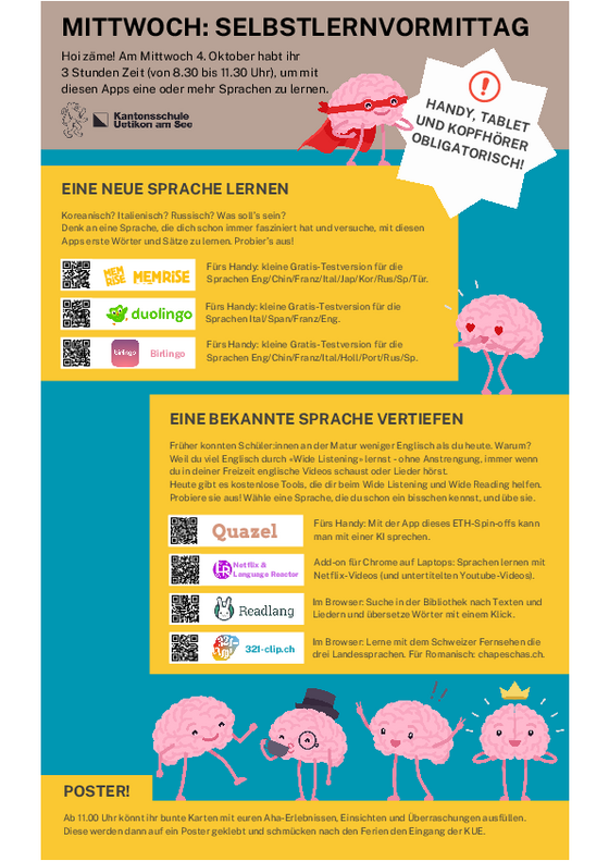 Am Mittwochvormittag kommen die Klassen wieder zusammen und probieren verschiedene Formen des autonomen Sprachenlernens aus. Dabei setzen wir auf (KI-)Sprachlernapps, auf die man im Alltag, im Studium und später im Berufsleben immer wieder zurückgreifen kann