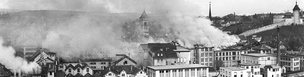 Am 1. April 1944 verirrten sich US-Bomber über Schaffhausen und warfen ihre tödliche Fracht ab. Resultat: 40 Tote, rund 450 Obdachlose und gegen 70 zerstörte Gebäude. Die Klasse 5d befasste sich mit dem tragischen Ereignis im Fach Geschichte und unternahm am 2. April auch eine Exkursion ins «Museum im Zeughaus» in Schaffhausen, wo eine ständige Ausstellung das Drama dokumentiert.