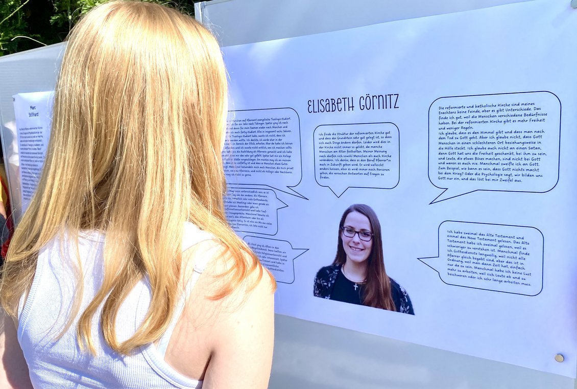 Freitag, 10 Uhr-Pause, KUE-Kiesplatz: Die Schüler:innen der 1c stehen vor ihren Plakaten und geben Auskunft über Porträts, die sie geschrieben haben: Zum Beispiel über den muslimischen Prediger Kemal Günay oder Elisabeth Görnitz, Pfarrerin in Stäfa, die auch von ihren Zweifeln spricht: «Manchmal zweifle ich an Gott. Wie kann es sein, dass Gott nichts macht bei Kriegen?»