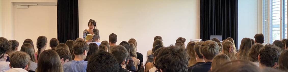 Eva Rottmann las am Donnerstagmorgen in der Aula daraus vor, danach stellten ihr die Schülerinnen und Schüler zahlreiche Fragen, die sie bereitwillig beantwortete. Oft fragte sie auch zurück, und in ihren Antworten zeigte sich, dass sie nicht nach einem Konzept schreibt, sondern sich die Figuren oft in Richtungen entwickeln, die die Autorin so gar nicht beabsichtigt hatte.