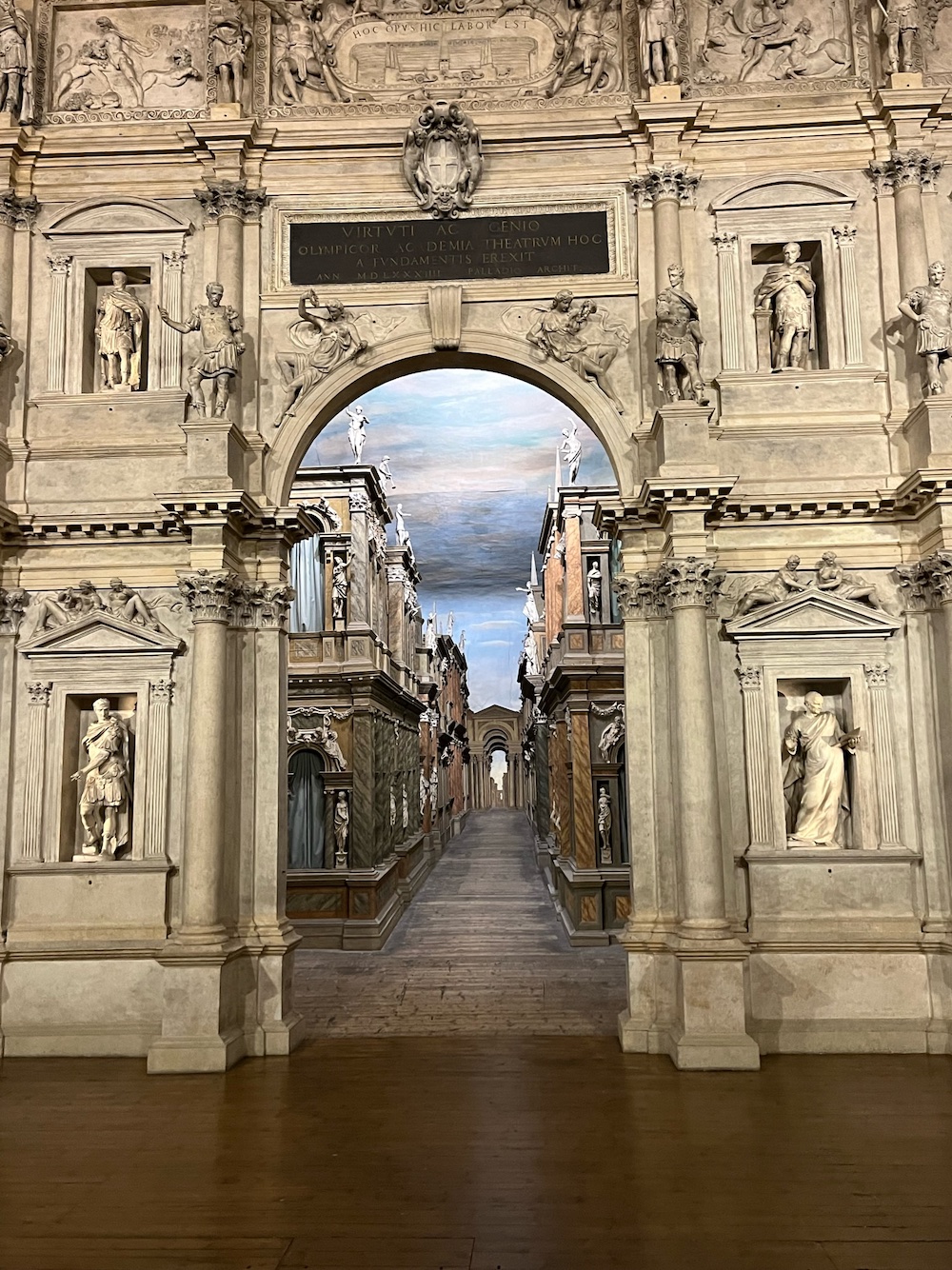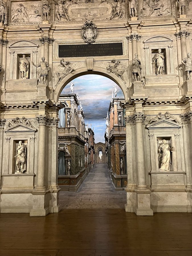 Ein sehr bekanntes Bauwerk, welches von Palladio entworfen wurde, ist das Teatro Olimpico. Die Olympische Akademie von Vicenza, also eine Bürgervereinigung, hat dieses Theater in Auftrag gegeben, da sie sehr an der Theater- und Bühnenkunst interessiert war. Es gilt als das älteste freistehende Theater der Welt und sein Bühnenbild ist ein perspektivisches Meisterwerk. Obwohl das Bühnenbild so schön gestaltet wurde, ist es nicht besonders praktisch, da es sich nur für wenige Aufführungen eignet. Im Theater findet man auch die Statuen aller Mitglieder der Akademie, die sich somit verewigt haben.