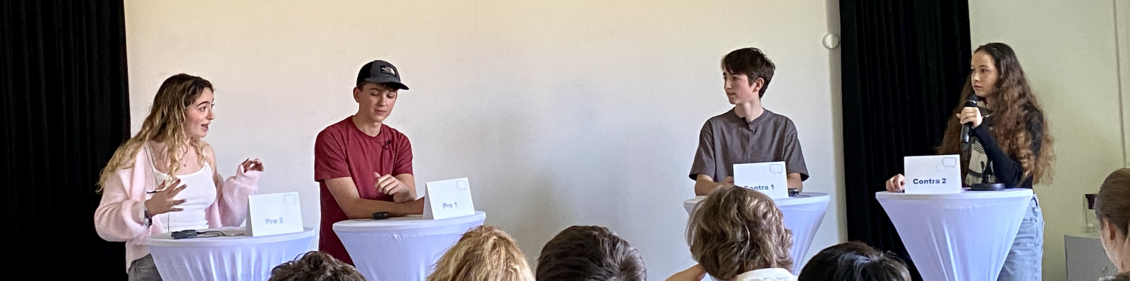 Die Debatte wurde von vier Schüler:innen der KUE geführt, die in klassenübergreifenden Teams gegeneinander debattierten. Sie hatten bereits eine erfolgreiche Debatte hinter sich, weil sie im Halbfinale schon gegen drei andere Schüler debattiert hatten. Die Debatte wurde von vier Jurymitgliedern bewertet, von zwei Lehrpersonen und zwei Schüler:innen der KUE.
