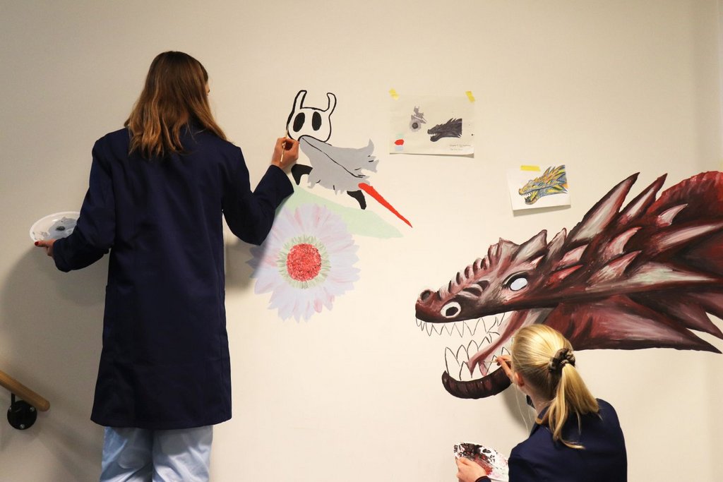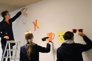 Auf den Wunsch einiger Schüler*innen der 4.Klassen ihre Schulzimmer Rückwand gestalten zu wollen, wurde ein Wand-Malerei Projekt lanciert. Dabei wurde die Gelegenheit genutzt auch gleich etwas Farbe in die Schulgänge zu bringen. Idee war es, dass die Schüler*innen die Motive selber wählen und dadurch ihren Schulraum mit ihren eigenen Bildwelten gestalten. Ebenso wurde von den Schüler*innen über die Farbkompositionen abgestimmt. Alle 4.Klässler haben eine Skizze zu ihrem Motiv eingereicht, ausgehend von welchen die Lehrpersonen für Bildnerisches Gestalten jeweils eine Komposition für die einzelnen Wände zusammengestellt haben. An einem ganzen Pool-Dienstag wurden die einzelnen Motive vorgezeichnet und gemalt. Während die 4.Klässler in den Pausen fleissig weitermalten, bestaunten die Jüngeren das Vorgehen. Umso mehr freut es, dass sich die SO dafür eingesetzt hat, bei einem nächsten Wand-Malerei Projekt stufenübergreifend arbeiten zu wollen, sodass alle sich beteiligen können, die auch gerne täglich ihrem Werk in den Schulgängen begegnen wollen.