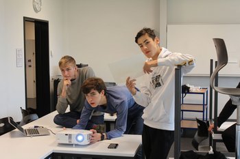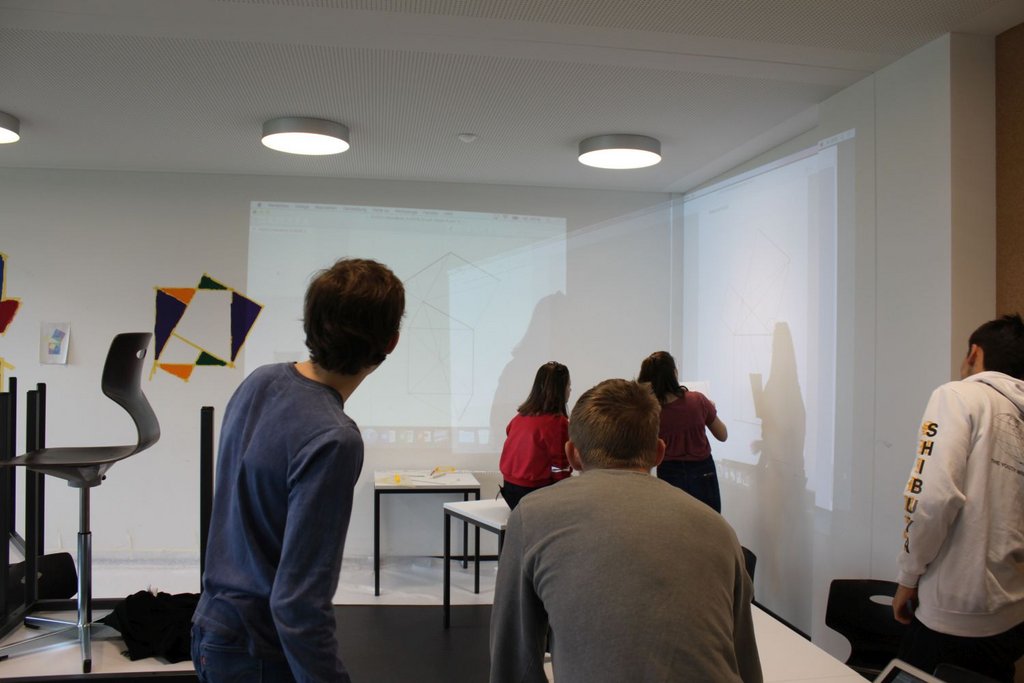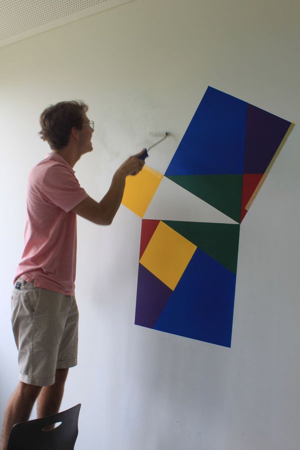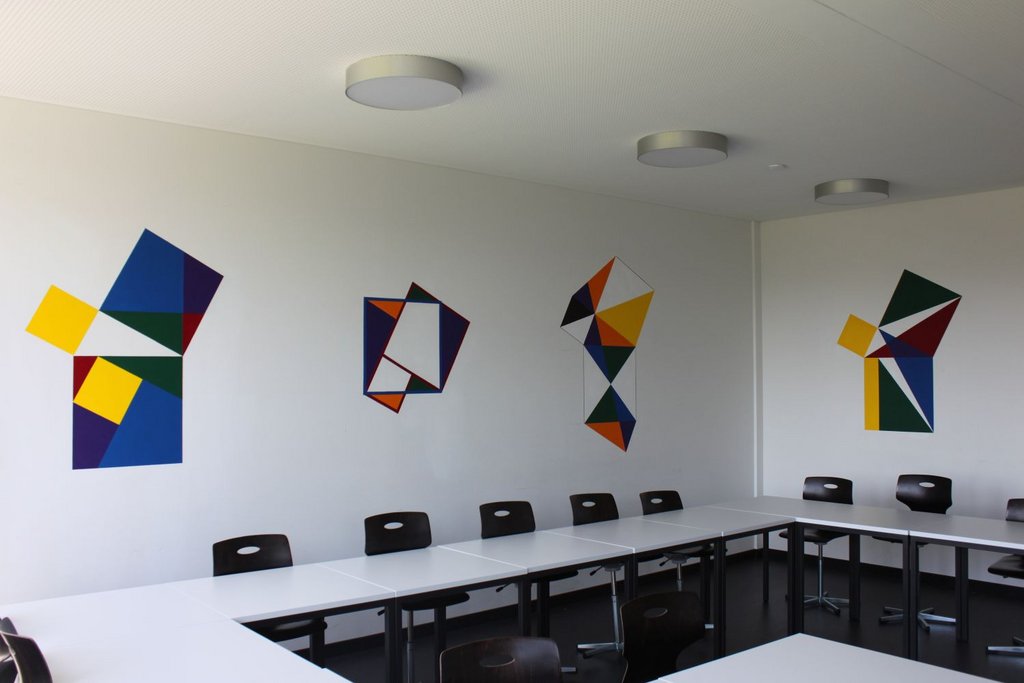 Der wichtigste Satz der Elementargeometrie ist der Satz von Pythagoras, der besagt, dass im rechtwinkligen Dreieck das Hypotenusenquadrat gleich gross ist wie die Summe der Kathetenquadrate. Vom Satz von Pythagoras sind mehr als hundert Beweise bekannt. Einige davon sind optisch attraktiv, weil sie den Beweis gewissermassen als Bildergeschichte erzählen. Vier dieser Beweise schmücken das Zimmer B108.